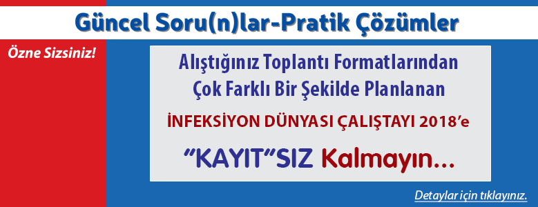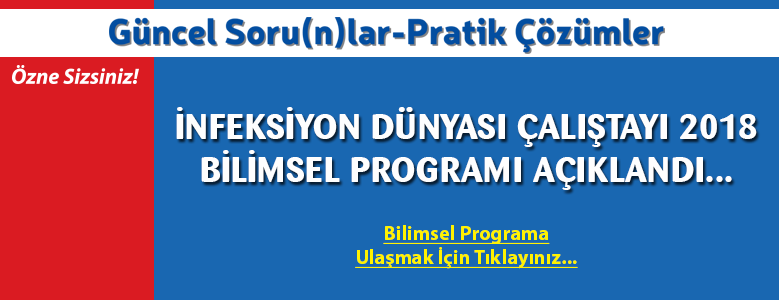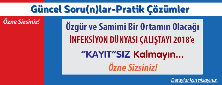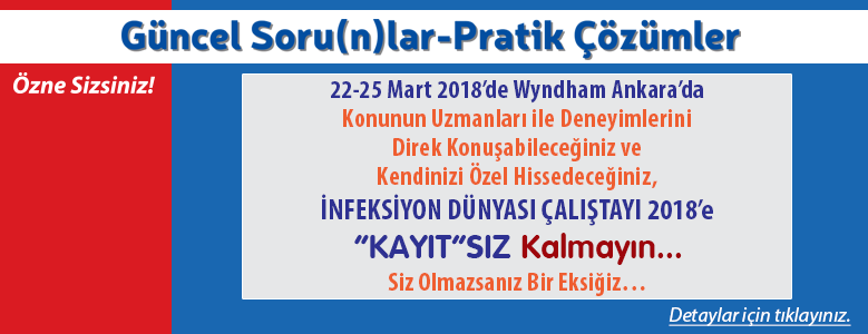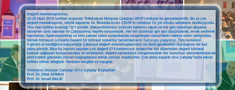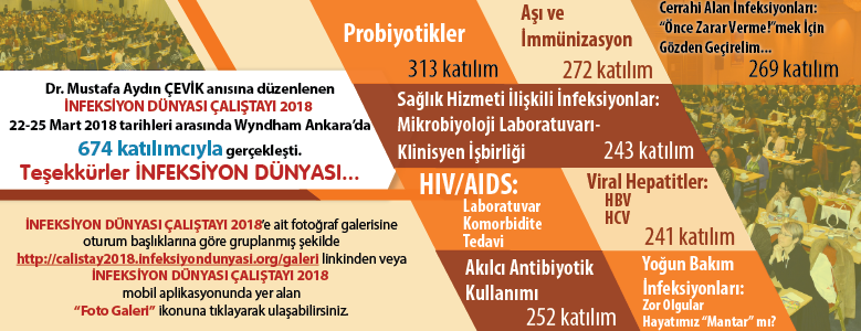 Konunun dinamizmi, her yıl camiamıza katılan gençlerin varlığı bir yana; aradan geçen süre zarfında gerek katılımcıların, gerekse katkısı bulunan bilimsel ve sektörel kuruluşların geribildirimleri İnfeksiyon Dünyası Çalıştayı’nın artık bir ritüel olması gerektiğini göstermekte. Aynı ruh ve şevkle daha iyisini yapmak üzere bu yıl da yola çıkıyoruz. 22-25 Mart 2018 tarihleri arasında bilimsel çıtası daha da yüksek, yine ön planda paylaşım ve tartışmalarıyla sürprizlerle dolu İNFEKSİYON DÜNYASI ÇALIŞTAYI 2018’de daha da yüksek bir katılımla buluşmak üzere… Yolumuz açık olsun…